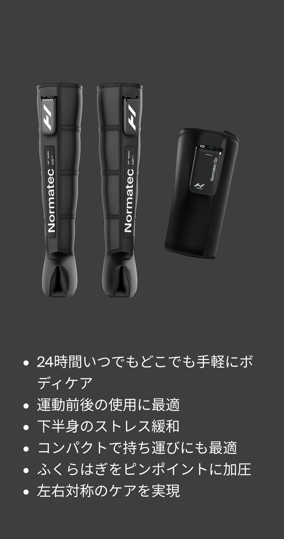 Normatecは、特許取得のパルス技術と、身体の異なる部位を対象とした製品ラインナップで他社との差別化を図っています。