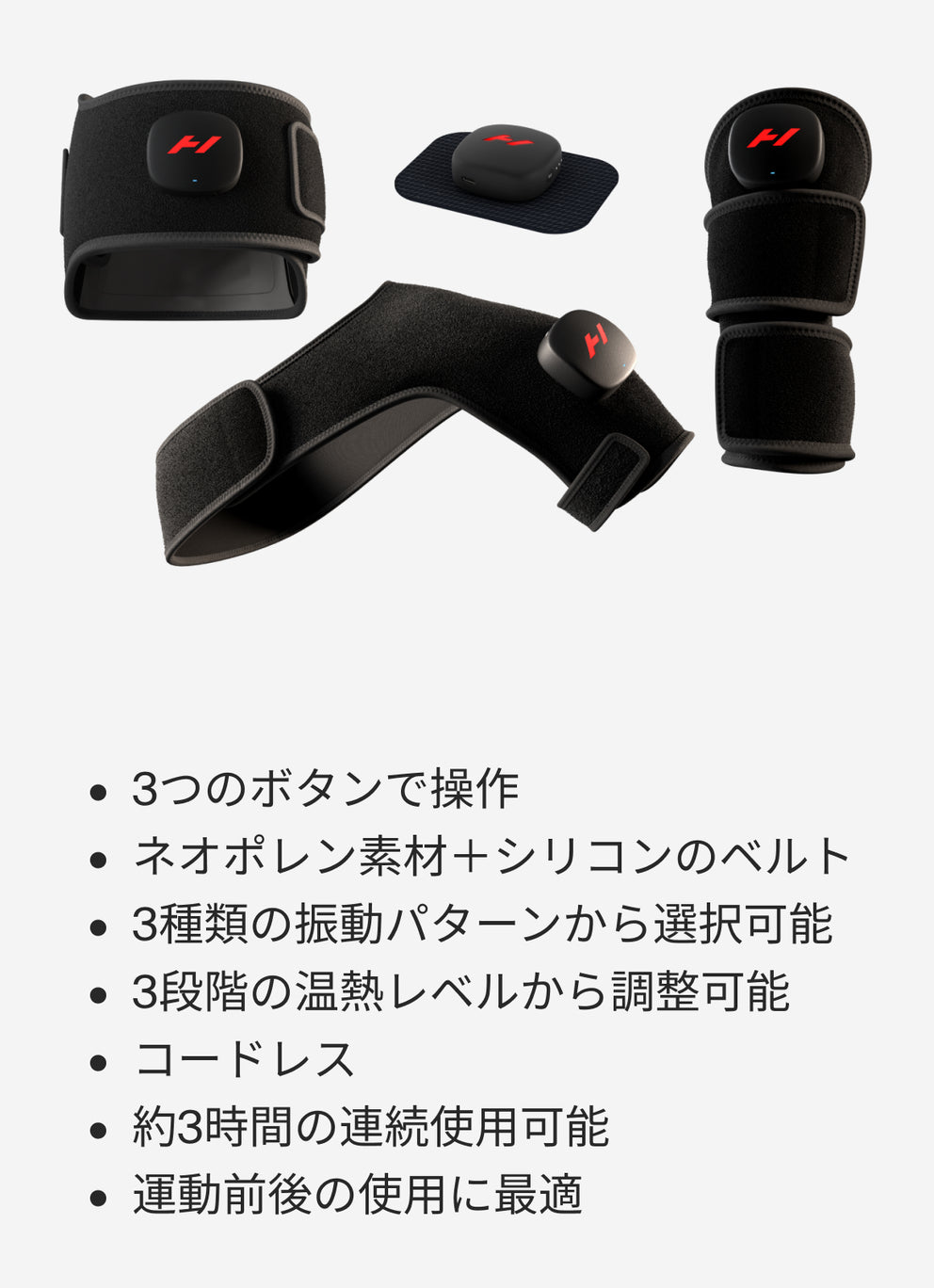 デバイスをケアしたい部位にしっかりと巻き付け、スイッチを入れ、ヒートレベルとバイブレーションレベルを調節します。