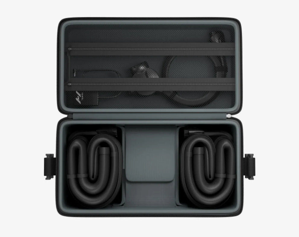 洗練されたデザインのキャリーケース。Hyperflux・Normatec Legs(ハイパーフラックス・ノルマテック レッグス)のコントロールユニット、ホース、充電器やその他の付属品を収納できます。