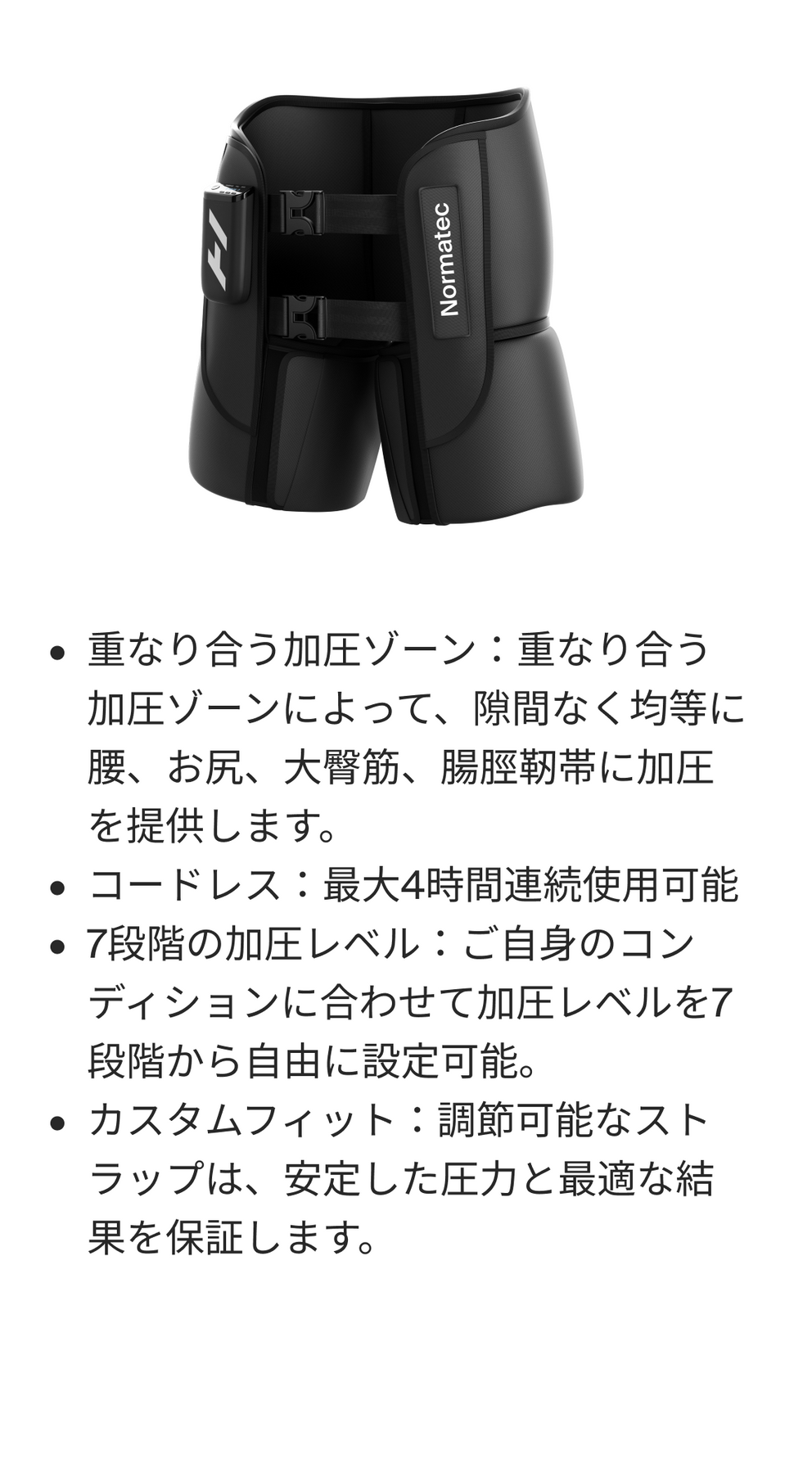 腰、お尻、大臀筋、腸脛靭帯を隙間なく均等に加圧する、完全にコードレスなダイナミック・エア・コンプレッションシステム。